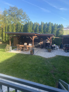 A kerben elhelyezkedő fedett grillterasz,  tavasztól őszig a társasági élet központja.